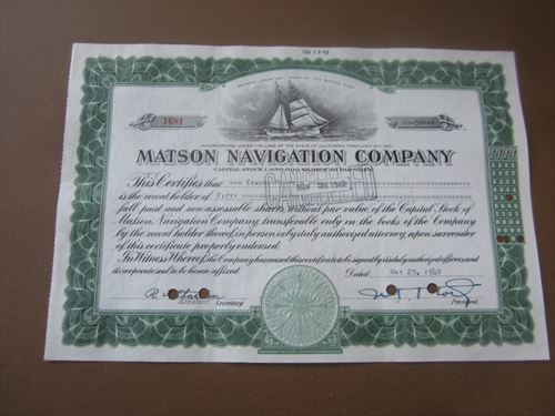 1940 - MATSON NAVIGATION - Stock Certificate - CA. - HAWAII TRANSPORTATION