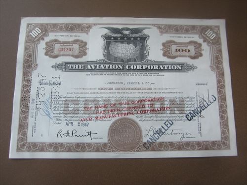 1947 - The AVIATION CORPORATION - Stock Certificate - 100 Shares - Tan